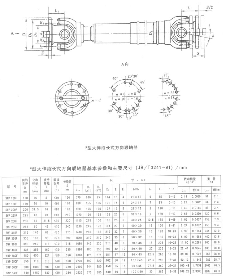 F型大伸縮長(zhǎng)型萬(wàn)向聯(lián)軸器基本參數(shù)和主要尺寸