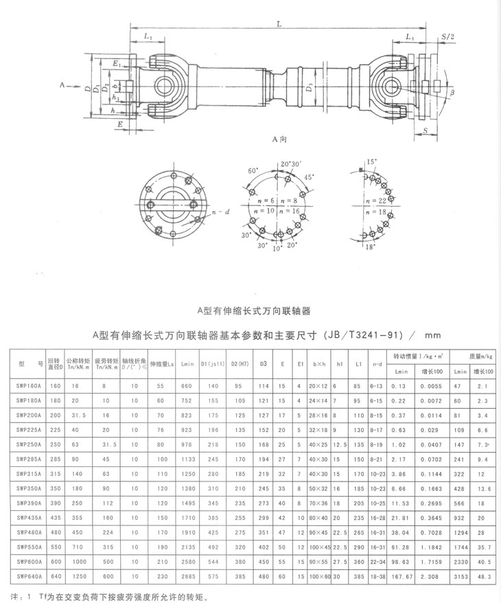 A型有伸縮長(zhǎng)型萬(wàn)向聯(lián)軸器基本參數(shù)和主要尺寸