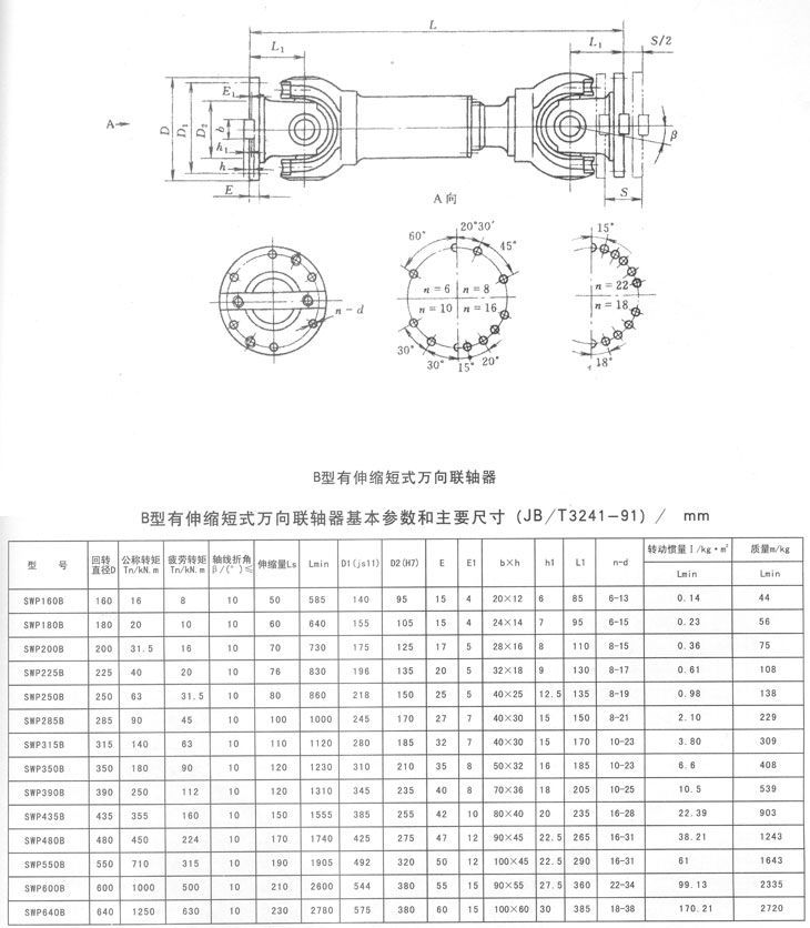 B型有伸縮短型萬(wàn)向聯(lián)軸器基本參數(shù)和主要尺寸